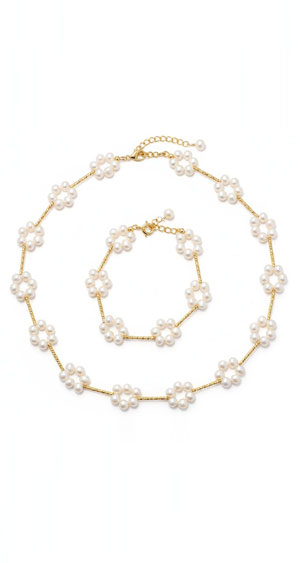 EM【eileen me】天然淡水珍珠編織花朵鎖骨頸鍊+手鍊 套組