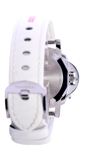 精鋼材質。全新LUMINOR DUE系列,超薄機芯,白色錶面,Saffiano小牛皮皮帶。