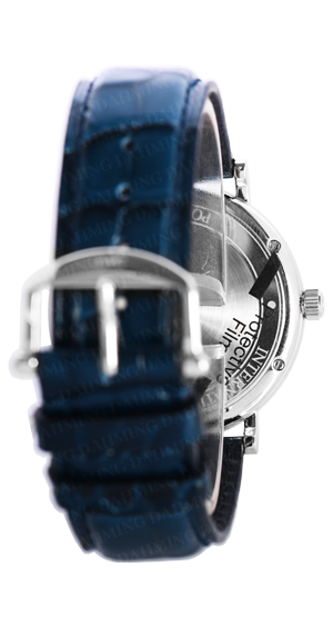 日期顯示,中央秒針附掣停裝置,白色錶面,藍色鱷魚皮錶帶,雙面防反光凸狀藍寶石玻璃錶鏡,搭配不鏽鋼穿扣。