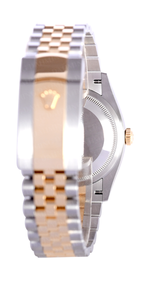 精鋼與18K金,綠色面盤,羅馬數字時標,VI、XI鑲有細鑽。經典五株帶。
