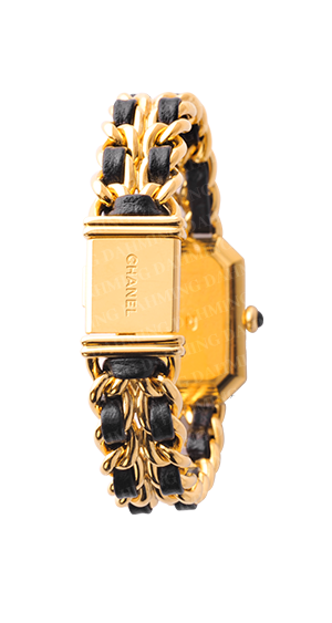 石英機芯請注意:每一至兩年需更換電池。經典Premiere系列,以知名手提包編織紋為靈感。精鋼材質鍍金與皮革。黑色漆面錶盤,鑲嵌凸圓形瑪瑙。適合手圍17~19cm。